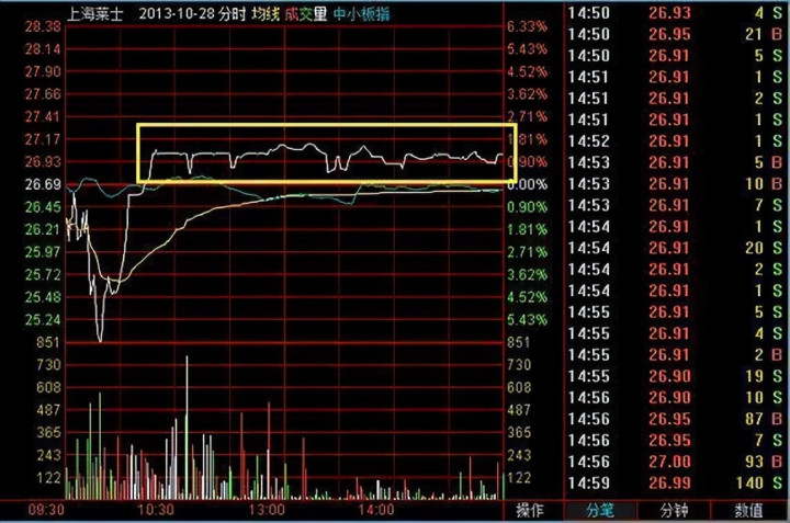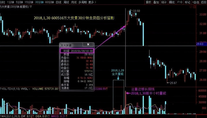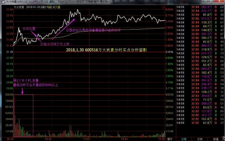 图示是 方大炭素 30 分钟 K 线图及本日分时图。从图中不错看出,30 日的第一个半小时,其成交量就达到了 29 日全天成交量的 50%以上。是以按前边说的表面,股价开动从分时图的日内均价下方上穿的时候,就是买点。那为什么这种情况,价钱上穿分时均价就不错琢磨开仓呢?