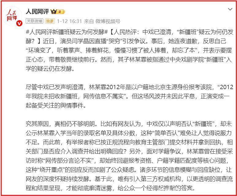 因为她曾在直播时说过新疆分数低,男儿读的是中戏新疆班,但林傲霏是汉族,户口在北京,网友质疑林傲霏就读中戏新疆班的合规性,怀疑内部波及到明星特权问题。