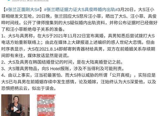 部分参考贵寓: 大S讼师就近期相聚假话发布严正声明,否定“大S出轨具俊晔”——潇湘晨报 【#张兰正面刚大S#】张兰晒把柄力证大S具俊晔婚内出轨——凤凰网文娱官网微博