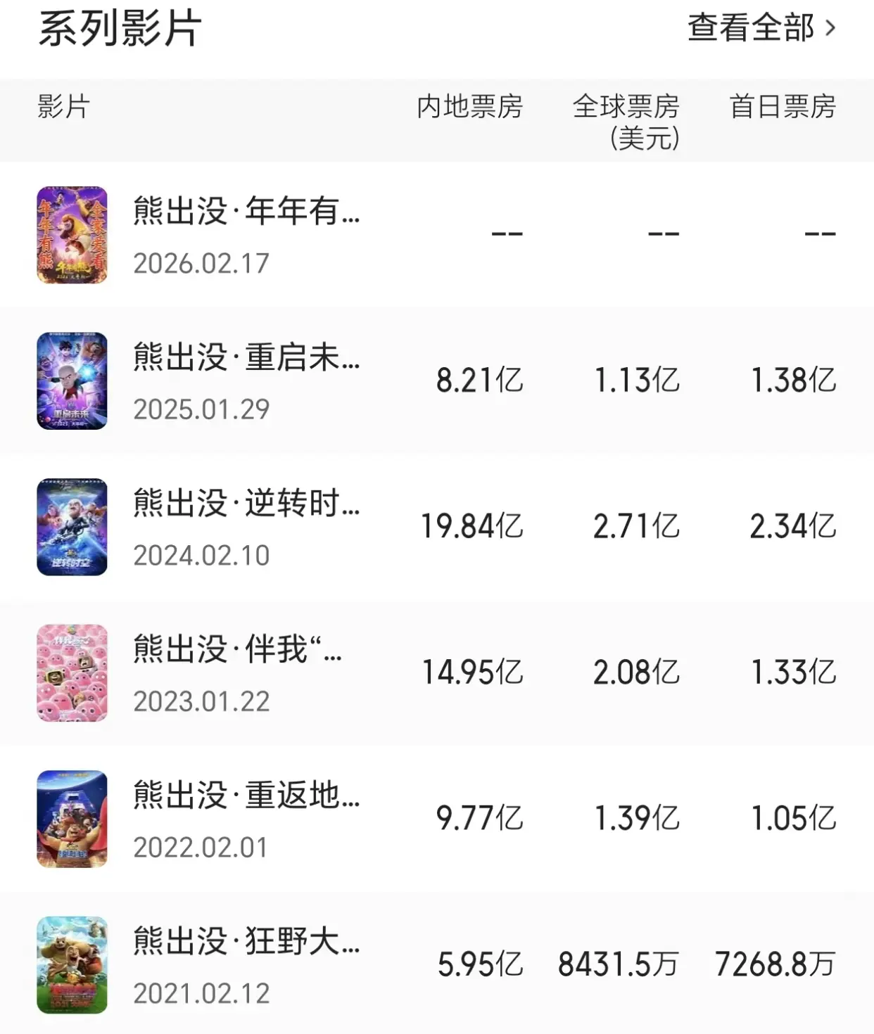 算作春节档的“钉子户”,《熊出没》系列每一部电影皆取得了雄伟收效。