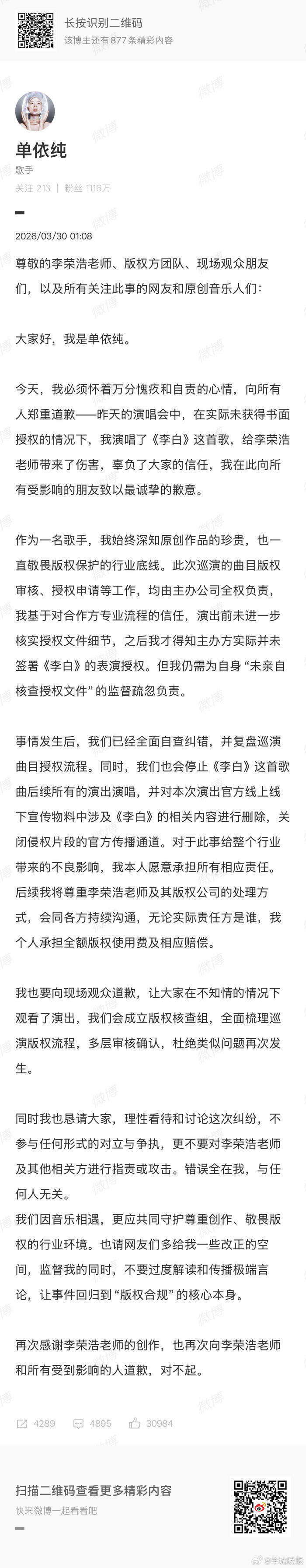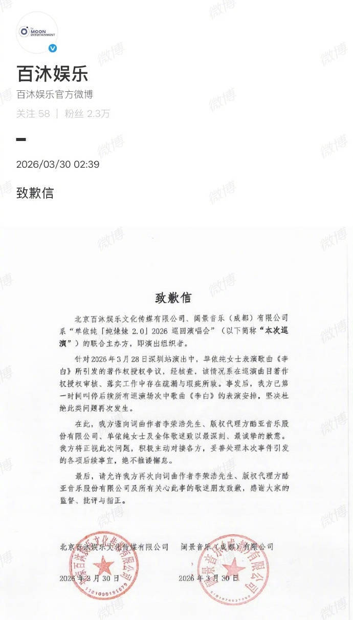 单依纯在事发后发布长文说念歉,承认流毒全在我方,并快乐个东说念主承担版权用度及抵偿,同期永久停唱该歌曲、删除干系宣传本色。其经纪公司也致歉称授权审核存在放松,叫停后续场次的该曲目饰演。然则,爱游戏体育有网友预防到说念歉本色未说起收到拒却邮件的事实,仅以团队未核实明晰为由,这一细节激发对诚意的质疑。