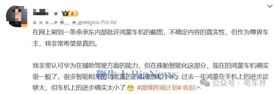有网友称,行动又名尊界车主,相配但愿该截图是真实。他相配认同华为在缓助驾驶方面的才能,但在座舱智能化部分,鸿蒙车机如实很一般。