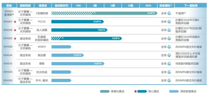 公司从糖尿病调治先行,进一步拓展臃肿、MASH、PCOS等代谢繁芜相干疾病调治的新妥当症,为代谢相干复杂疾病的异病同治提供具有系统率疗技艺的自然药物,有望填补海外空缺。除交易化家具,公司领有8款在研候选药物,包括三款中枢在研家具WH007、WH006、WH002。