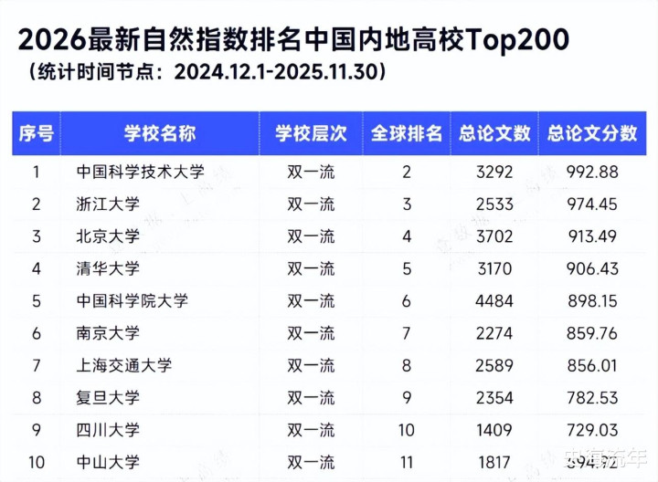 近日,当然指数官网更新了最新的当然指数排行。在《2026年新当然指数排行中国内地高校TOP200》中,中国科学本领大学以992.88的总论文分数,居位居各人高校第二、中国内地高校第一。