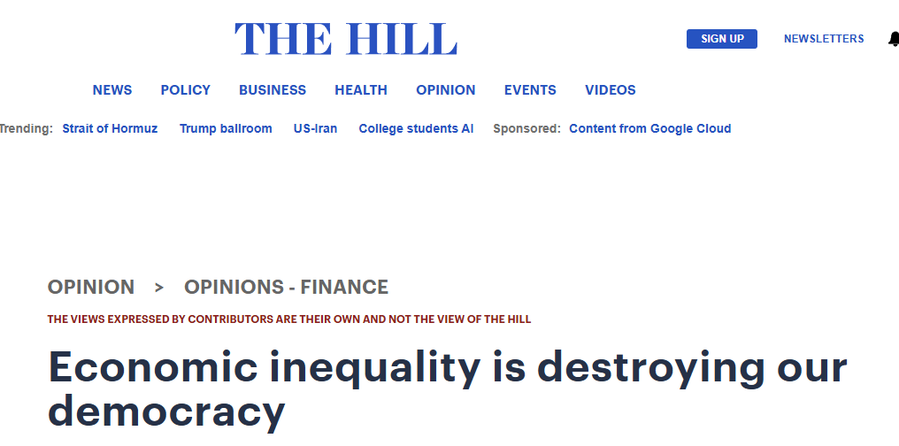 好意思国《国会山报》 4月12日刊发题为《经济不对等正在扯破好意思国民主》的驳斥著作,以大皆实证数据揭示了好意思国社会日益加重的钞票分化景观。