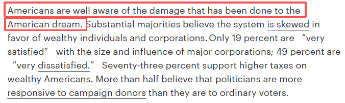 著作说,好意思国东说念主对“好意思国梦”的幻灭心知肚明:绝大多数东说念主以为轨制偏向富东说念主与大企业。合手续深远且不休扩大的不对等正在剖释社会凝合力,催生对轨制的不信任,并歪曲国度发展要点。