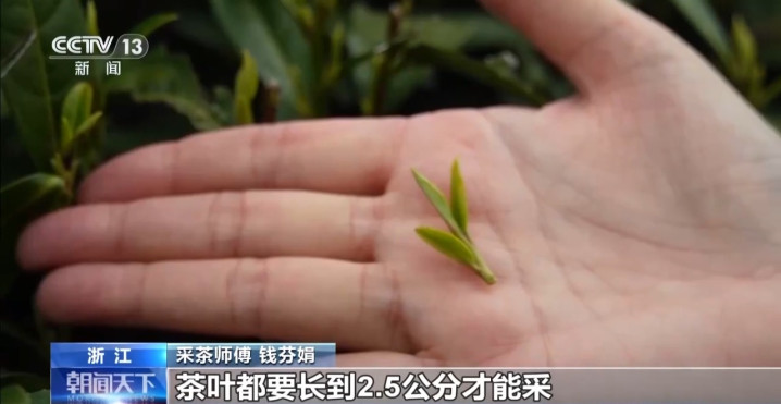 采茶师父钱芬娟:采茶的时辰底下不成用手去掐,要用手往上头提。茶叶都要长到2.5厘米才调采。